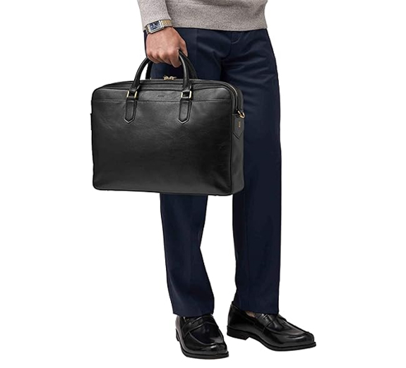 Soft, textured leather. Very minimized branding. Professional without looking stuffy or stiff. Review of the double-zip briefcase can be found here to give you an idea. These have creeped up in price over the last year or so, but they’re still a good, dependable, stylish option.