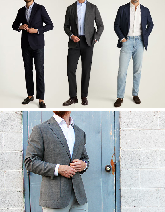 Lots of colors and patterns. The structure of a true sportcoat made with flexible and comfortable knit fabrics. One of their bestsellers. Not as droopy as a lot of other knit “swazers” from other brands. These do have real shape to them. Bottom line: if you want something less formal than a standard woven blazer, but still can dress up with a collared shirt, then these are those. Fabrics are either cotton, wool blend, or cotton blend.