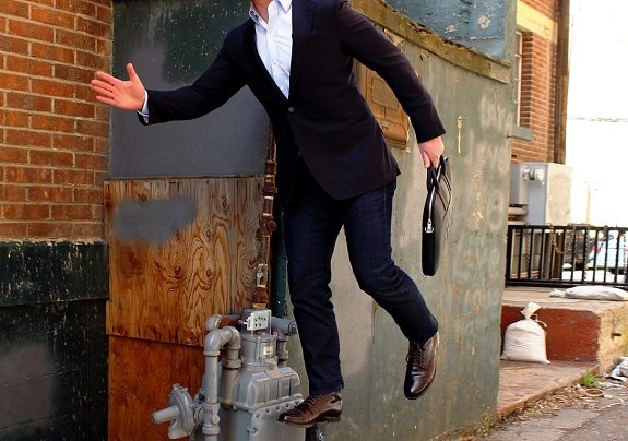 A true example of the “business mullet.” Dress shirt and blazer (business) up top, jeans (party) down below. Keep your jeans dark, your shirt crisp, and your blazer modern and minimalist. Again, no flash. No gold buttons please.