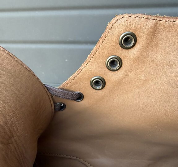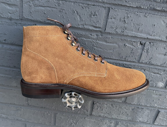 The suede upper is the star of the show here and it’s genuinely lovely material with a soft hand and consistent nap that suggests quality hides chosen for this price point. While this suede is not as luxurious as something from a first-rate tannery, it has enough visible and tangible texture to feel substantial without being overly rough or nubby or “cheaplooking. Stitching around the quarters is tight and even, using what appears to be a tonal thread that keeps the focus on the suede itself rather than creating high contrast detailing. The plain toe design is structured but not overly bulbous. It maintains a sleeker profile that contributes to the boot’s versatility. Hardware consists of five sets of antiqued brass-colored eyelets at the lower portion transitioning to three sets of speed hooks higher up the shaft. For me, this practical choice helps getting in and out easier while maintaining clean lines. The eyelets and hooks feel substantial and are set securely without any wiggle or loose feel. One small quibble: the tongue padding is somewhat minimal. If you cinch these down tight, you might feel the laces pressing through.
