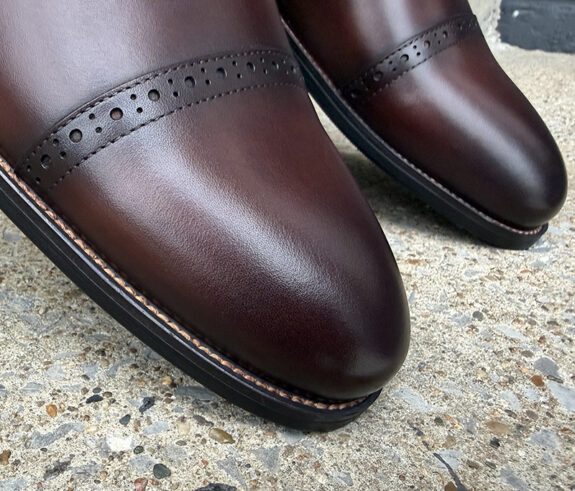 The upper’s brogue detailing is executed with impressive restraint and precision for this price point. The cap toe perforations follow clean, symmetrical patterns without becoming overly ornate, while the smooth toe displays tasteful restraint. Instead of adding a brogued medallion on the toe, Spier chose to keep the toe plain to help keep these squarely in the formal realm. The leather itself appears to be a “good enoughquality hide with good color depth and natural texture variation. Stitching throughout the upper shows consistent tension and straight lines with no loose threads or uneven spacing visible in the initial inspection. The eyelet placement is properly aligned, and the lacing system sits flat against the vamp without puckering. One note: the tongue color is slightly lighter than the surrounding facings on both shoes, which is probably a manufacturing defect, but it gives a subtle two-tone effect that isn’t horrible.