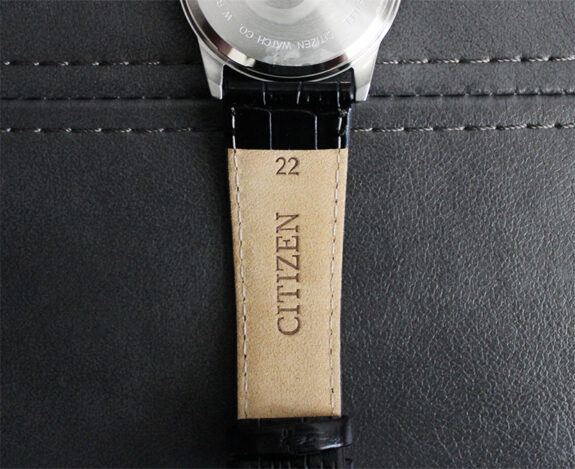 22mm wide leather band doesn’t look or feel cheap.Croc embossed top side, soft nubuck-like underneath.