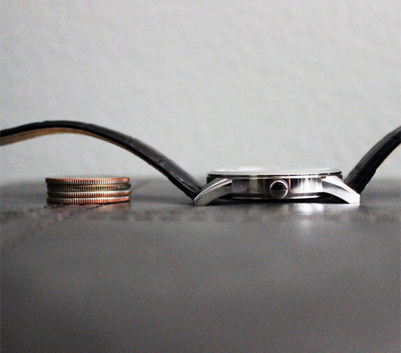 Dress-watch trim at 8.5mm thick.Shown with quarters for scale.