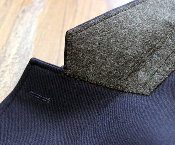 Mid-weight wool blend “workhorse” twill. Felt undercollar.