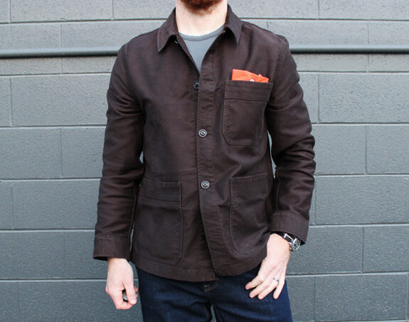 Size shown is a medium on 5’10″/180. Available in brown or black. It’s not the super soft, plush, almost suede-like cotton moleskin many of us are used to. It feels more like canvas. There’s a very, very light brushed feel to it, but there’s no “squish” factor some other moleskin fabrics present. Still though, quite good. A brand new arrival. Should look great with everything from t-shirts to polos to over a sweater when it gets truly cold. And don’t think these are limited to “outerwear” use. Sure you could wear them as a light jacket, but more often than not those of us who love our chore jackets (my hand is raised) they’re worn like a super casual sportcoat/extra layer over tees, henleys, etc.