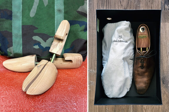 Cedar shoe trees are used to help keep the uppers from twisting, curling, and shrinking as the shoes dry out. Plus, the cedar wood is antibacterial and can absorb excess moisture and deodorize your shoes. I personally enjoy the smell of cedar, but if you don’t, you can get shoe trees made from beech, maple, ebony, etc. Try to avoid plastic trees unless they’re for travel.