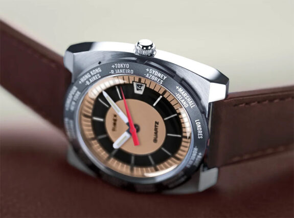 Inspired by the space age designs of the 1960s. “Period correct” acrylic crystal, so it may pick up some scratches, but a tube of PolyWatch will help fix those. See a review of a similar but not identical model from this new Jet line over here.