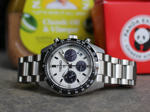 Full review here. Panda-dial racing good looks. Dependable, super accurate, solar-powered quartz movement. Build quality is really impressive. It just feels good on your wrist. Not flimsy. Not rickety. It’s solid. Also looks great on a leather strap. (Standard, perforated rally, “bundstrap, etc.)