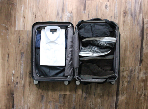 Proof it all fits. Bag Shown is the Samsonite Freeform 21-inch Carry-On – $150ish(There’s a flap that folds over to separate each section, but…pack your dress shirt deeper than shown above so the shoes don’t smash into it.)