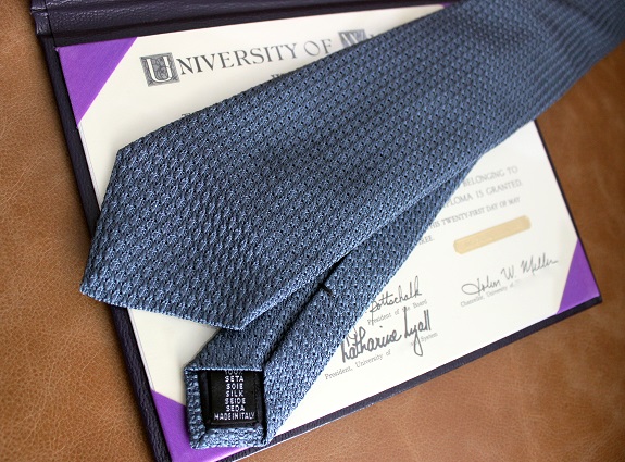 Whether it’s your graduation or someone else’s, wearing a tie is a great way to mark a significant achievement. You are probably going to take a lot of pictures that you will look at for years to come, so you want to look your best. And a tie looks nice under a graduation gown. (Tie shown: Kent Wang Steel Blue Grenadine – $75)